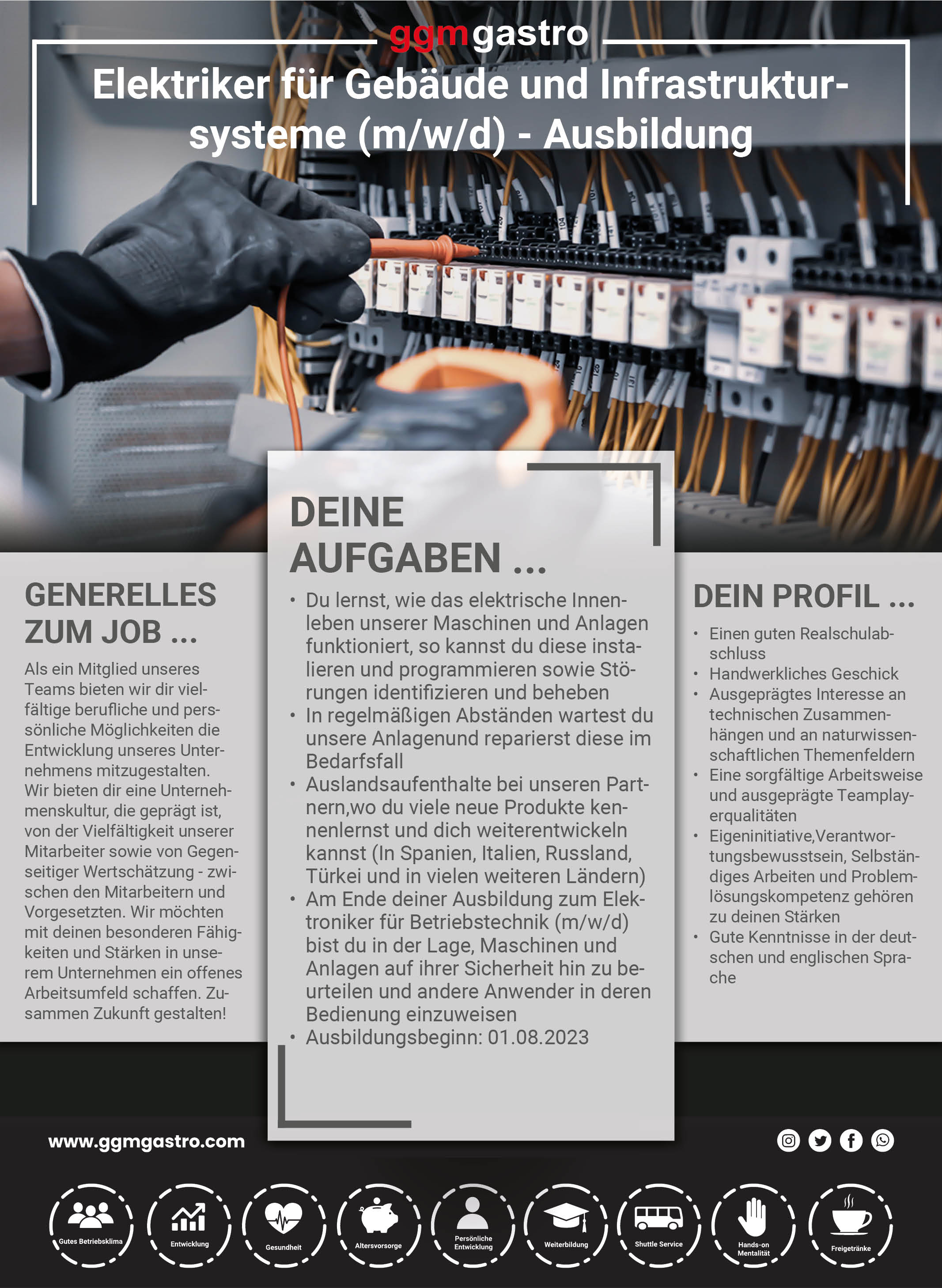 - Am Ende Deiner Ausbildung zum Elektroniker für Betriebstechnik (m/w/d) bist du in der Lage, Maschinen und Anlagen auf ihre Sicherheit hin zu beurteilen und andere Anwender in deren Bedienung einzuweisen